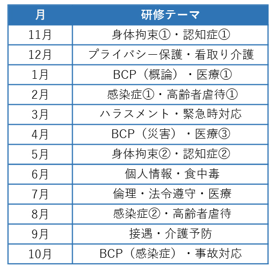 A. 身体拘束・認知症・感染症・ハラスメント・BCPなど、介護保険法で定められた法定研修をすべてカバーします。